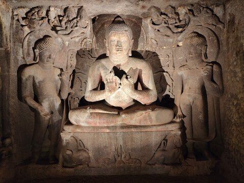 AJANTA, INDIA - FEBRUARY 6, 2017: Buddha image in a  monastery (vihara) carved into a cliff in Ajanta, Maharasthra state, India