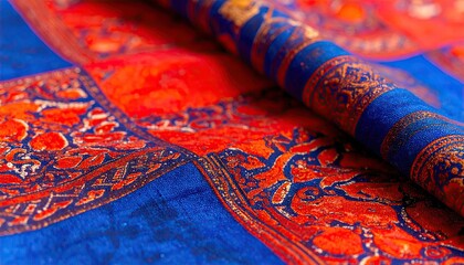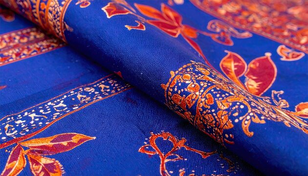 Close-Up Shot of Beautifully Crafted Ajrakh Textile with Intricate Patterns and Rich Colors, Showcasing the Artistry of Traditional Indian Fabric Design