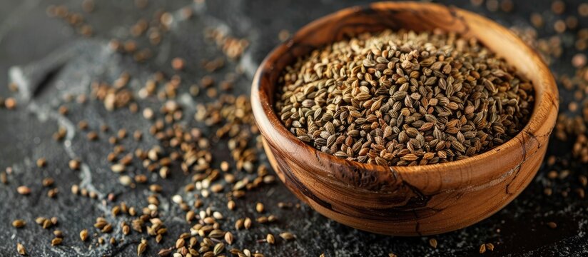 Ajwain seeds closeup in a wooden bowl on a dark slate backdrop with room for more elements in the image. Creative banner. Copyspace image
