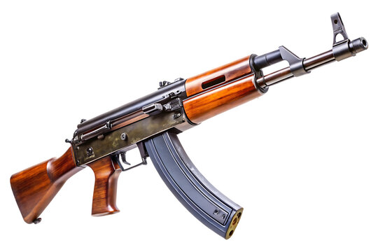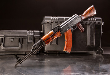 Copy space image of a red AK 47 rifle on a rustic metal background is available