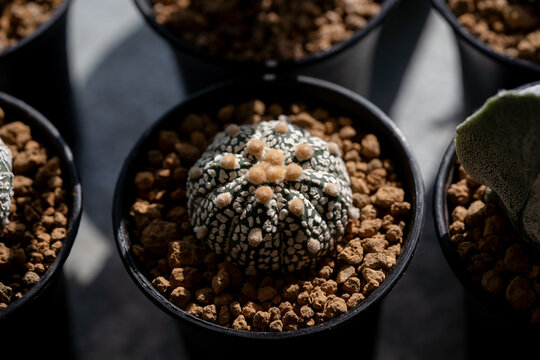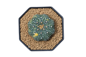Astrophytum Asteria Super Kabuto cactus with akadama stone in pot.