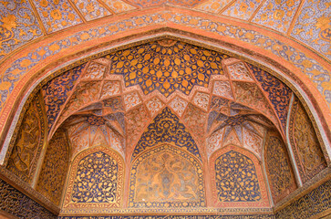 Colourful Interior of the Tomb of Akbar the Great, intricate decoration in Akbars tomb in Sikandra, Mughal architecture, built in 1605-1613, Near Agra, Uttar Pradesh, India