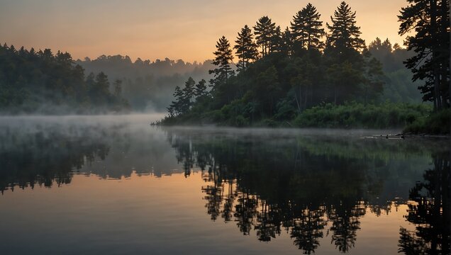 ake in the morning with the sun rising over the trees.