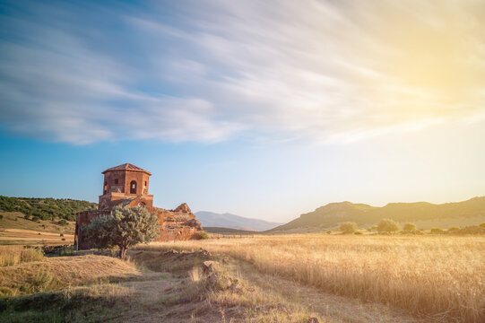 Red church ruins in Nigde province, sunset colors and clouds in the sky and sun light
