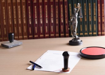 Contract waiting for a notary public sign on desk. Notary public accessories