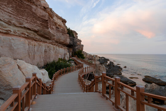 The Caspian Sea. The rocky shore of the Aktau city embankment in Kazakhstan. The ocean is calm and the sky is overcast