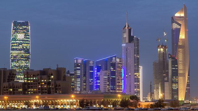 Skyline with Skyscrapers day to night timelapse in Kuwait City downtown illuminated at dusk. Kuwait City, Middle East