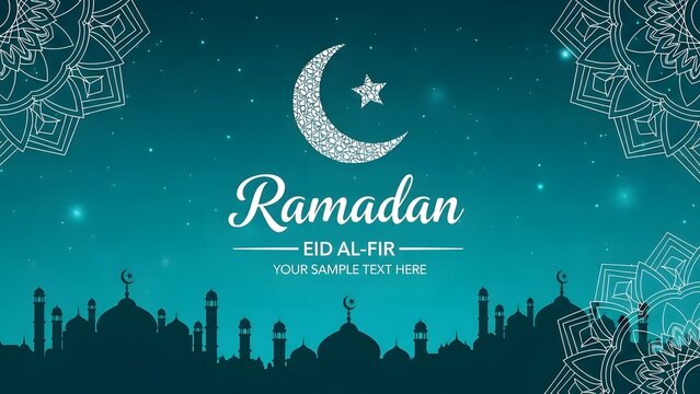Ramadan eid al fitr mubarak celebration with crescent moon and city skyline on blue background