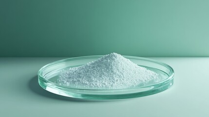 Aluminum oxide powder displayed in circular glass dish, delicate powder formation, mint green glass border, technical product photography, clean composition, neutral backdrop