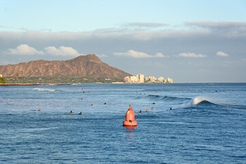 Surfers at sunset at Ala Moana Beach Park near Kewalo Harbor in Honolulu Hawaii with Diamond Head Crater in the background