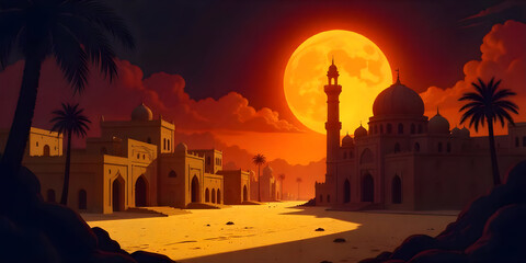 Ancient arab city with market and palace in the desert. Modern cartoon illustration of yellow traditional houses, an antique castle, mosques, palm trees.