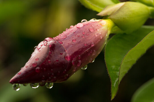 Pink alamanda flower with green leaf in morning rain captured under blue sky