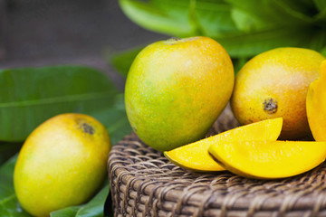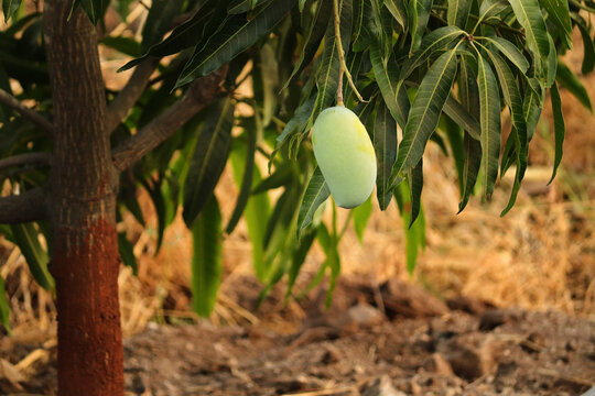 Bunch of green unripe mango fruit hanging on its tree. king of fruit is kesar mango. fresh Kesar Mango. Organic Natural Kesar Mango From gir forest (Yellow Orange Pulp with Green Skin and Juicy Flesh)