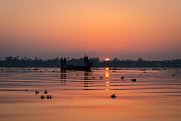 Indian fishermen standing on their boat in the morning with the orange rising sun in the background.