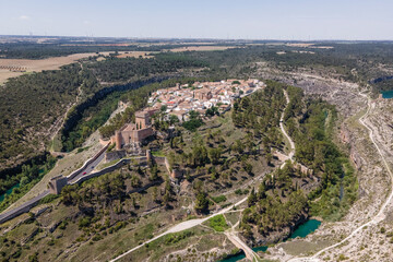 Aerial view of Alarcon, a medieval town with castle on top along the Rio Jucar river in Cuenca, Spain.