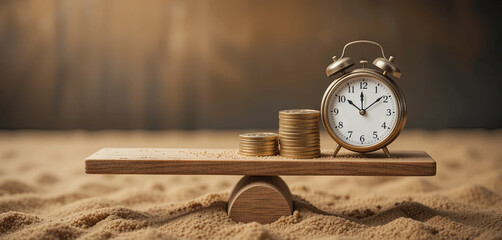 A wooden scale holds stacks of coins on one side and an alarm clock on the other, symbolizing the relationship between time and money against a sandy backdrop