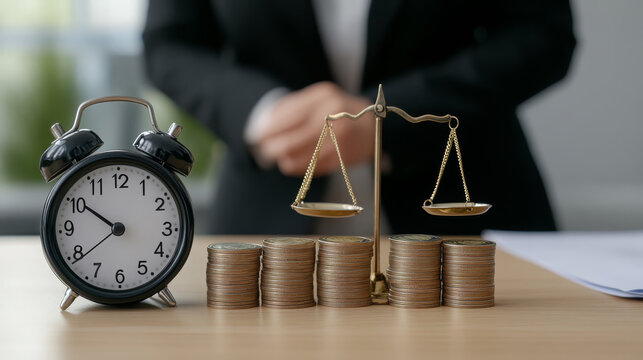 Balancing Time and Wealth: A golden alarm clock juxtaposed with stacks of coins on a balanced scale, set against a minimalist backdrop