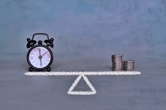 Balance between time and money concept. Alarm clock and stack coins on balance scale
