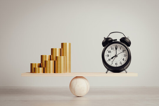 Money and Time balance concept, Stacks of coins and clock on scale board. 3D illustration