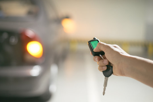 The man in the hand held the remote control of the car, he opened the remote control of the car door. To drive a car