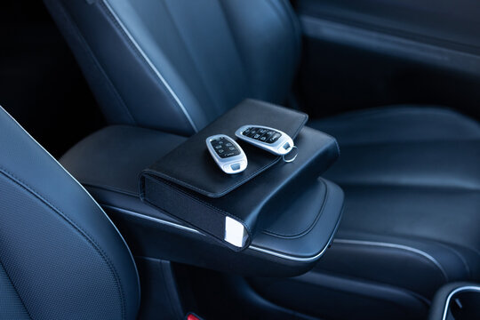 Black car remote key  There is a small loop hanging on it and there are 3 gray buttons for locking and unlocking the car, 1 red button for horn (Use in Emergencies). smart key system for modern cars.