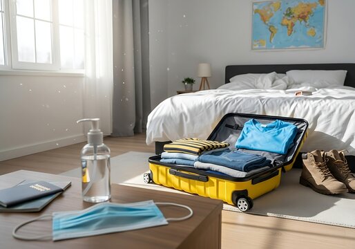 Siap berpetualang, sebuah koper yang penuh sesak diletakkan di kamar tidur yang cerah menunggu perjalanan dengan paspor dan masker