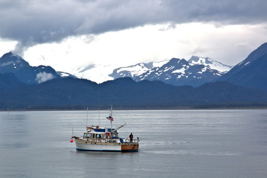 Scenic view of Homer spit and Alaska mountains and glaciers