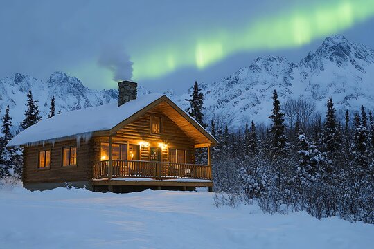 Cozy Cabin Illuminated Under Aurora Borealis Mountains
