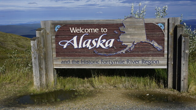 Juneau, Alaska, USA - July 19, 2011: Closeup, Frieze of Alaska State Capitol, stating as much, on top of marble pillars. Brown stone building.