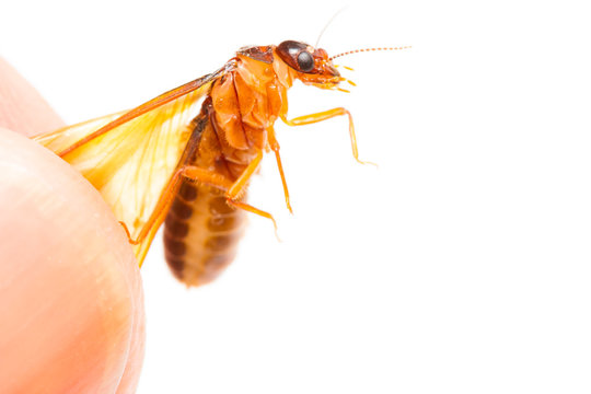 Alate or termite white ant in hand on white background