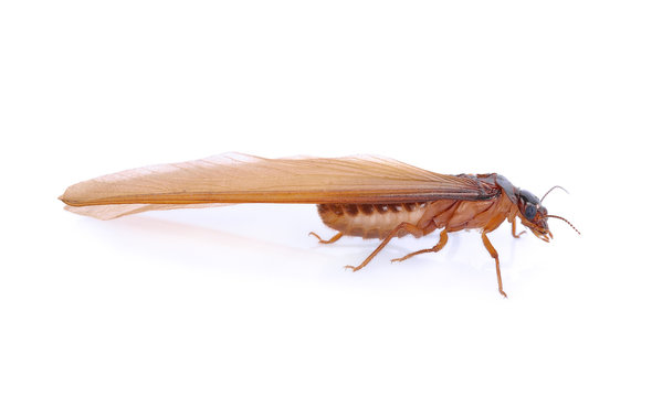 Single black garden flying ant, Lasius niger, alates, on white background, after leaving nest for nuptial flight on flying ant day