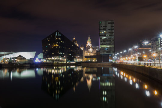 Aerial sunrise view of Liverpool waterfront shows Museum of Liverpool, Mann Island, Port of Liverpool Building, Albert Dock, and a moored vessel marked Liverpool.