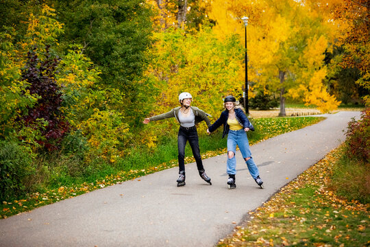 Two teenagers rollerblading together in a city park during a warm fall afternoon; St. Albert, Alberta, Canada