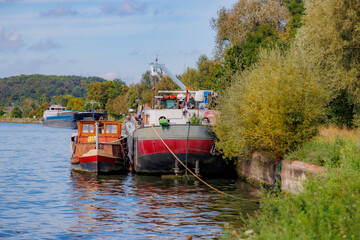 Two boats anchored at a dock berth on Albert Canal, cargo ship in background, abundant wild vegetation and mountains with green trees against misty blue sky, sunny summer day in Kanne, Riemst, Belgium