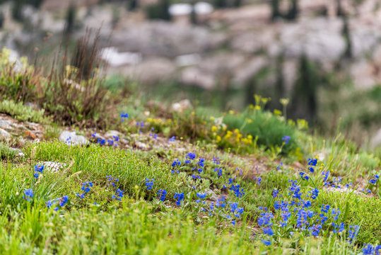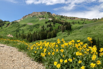 Albion Basin, Utah summer with blue and yellow many wildflowers flowers in Wasatch mountains on meadow