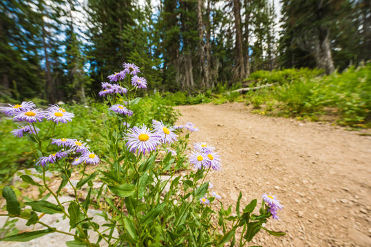 Showy Daisy/Fleabane wildflowers near a dirt road in alpine forest in Albion Basin close to Salt Lake City