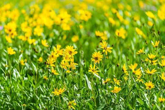 Albion Basin, Utah 2019 wildflowers festival summer season in Wasatch mountains with closeup of meadow and pattern of many yellow Arnica sunflowers flowers