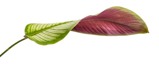 Curved tropical green leaves of Calathea Ornata Albolineata with different colors at the bottom on isolated background