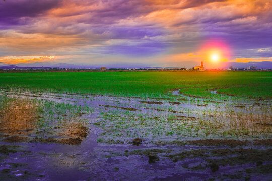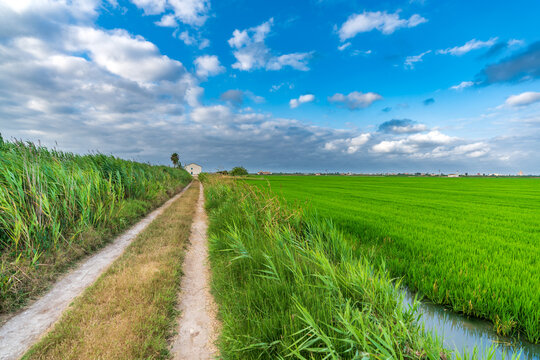 Irrigation ditch in a rice field in the Albufera of Valencia, Spain
