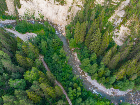 Aerial view famous mountain in Filisur, Switzerland. Landwasser Viaduct - world heritage with train Glacier express in Swiss Alps.