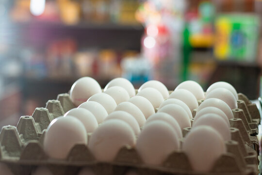 view of several white hen eggs, placed in a glass display case. sale of eggs in a grocery store. eggs rich in albumin protein ready to be sold and consumed in different foods. food concept