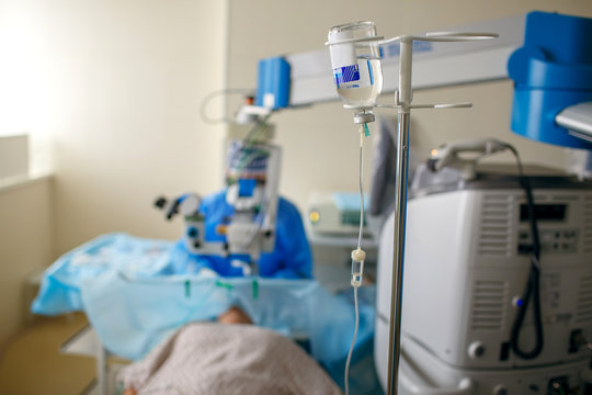 Physiological solution in the form of a dropper close-up in the ward of the hospital. Doctor and patient who lies on a bed in a ward room