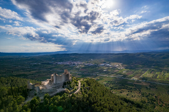 Fotografía del castillo de Alcalá / Alcossebre, ubicado en la sierra de Irta, durante un atardecer con nubes al fondo y rayos de luz.