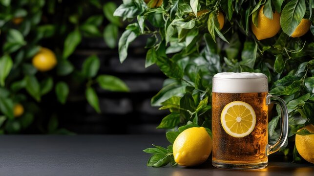 Refreshing Beer with Lemon Slice in a Mug, Surrounded by Lemon Tree, Perfect for Summer