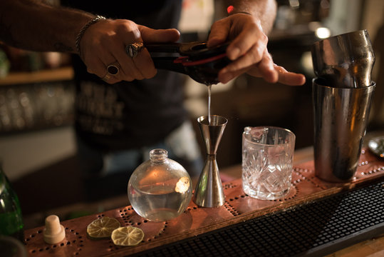 Chef in the kitchen leans pan to the side for alcohol in it to catch fire for gas stove, starting to flambe the food