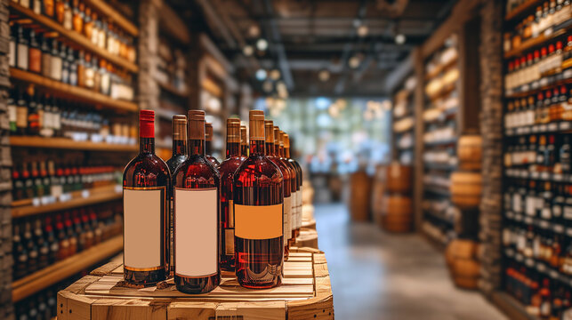 Liquor store background. Alcohol retail industry. Wine bottles on shelves in wine shop.