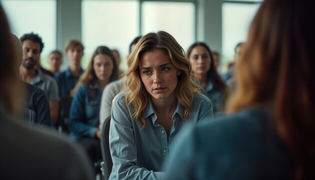 Diverse people sitting in a close circle and talking to a therapist. Group therapy session