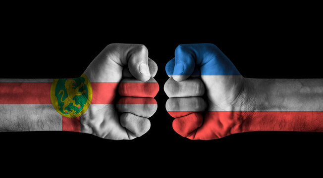 Skydiver parachuting with canadian and american flags against cloudy sky