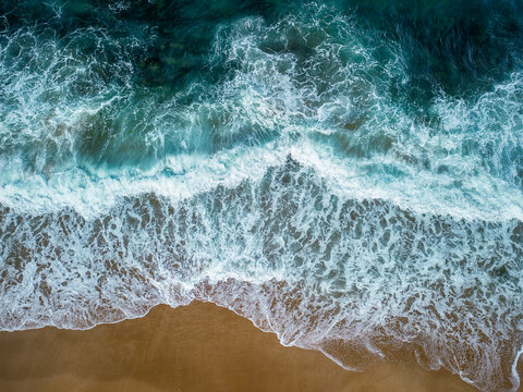 Aerial top view of Black sea coast with big waves near Alepui wild beach, Bulgaria. Drone picture.