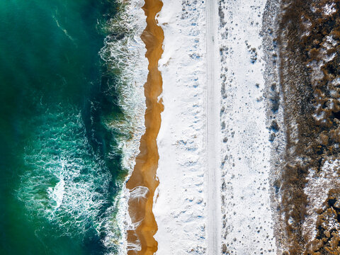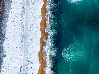 Winter landscape of Black Sea coast at Alepu driver's beach under snow.